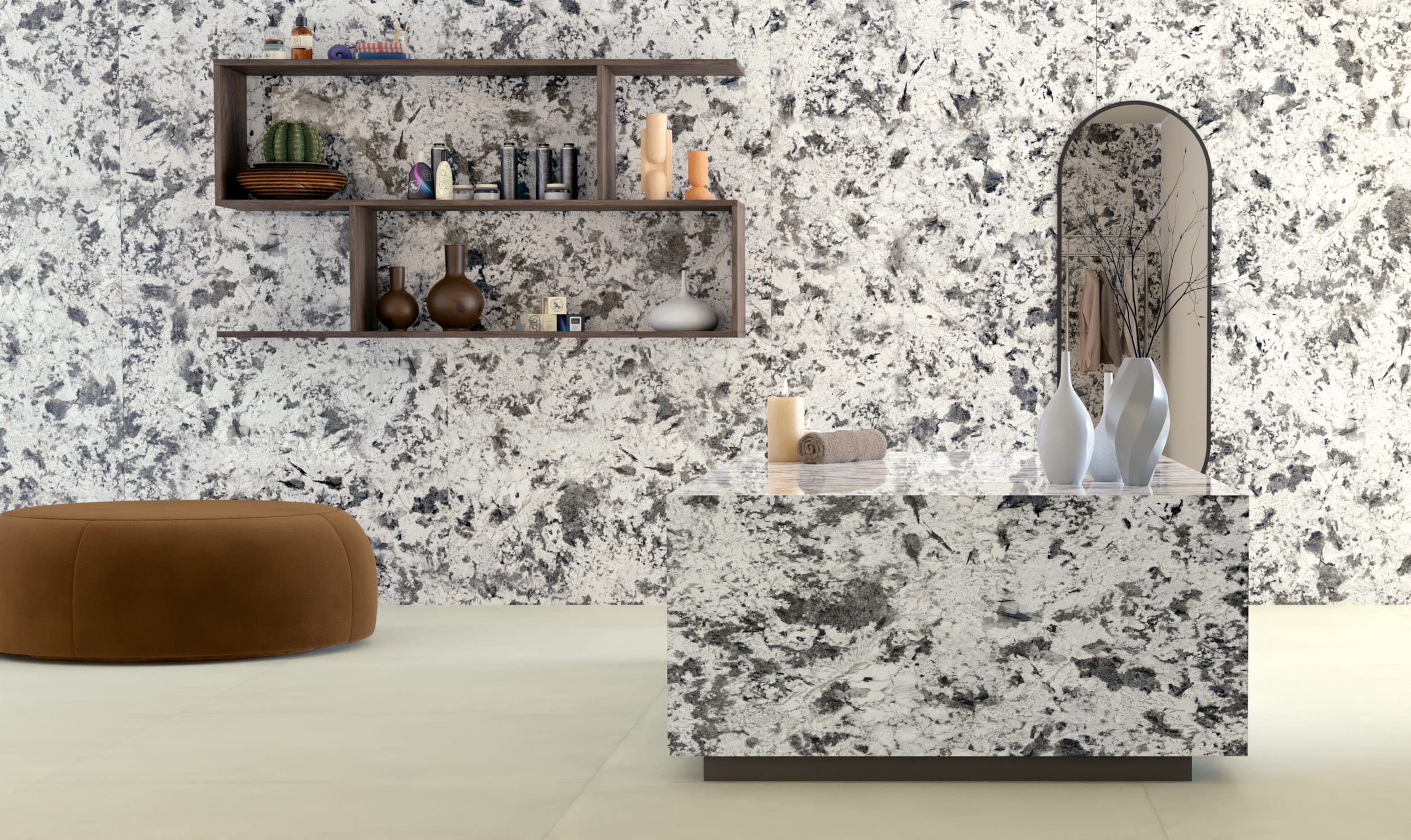 Alaska è una grande lastra dal look chiaro e luminoso, perfetta per valorizzare tavoli, top cucina e banconi con una grafica pulita e contemporanea. Nel formato 163×324 cm e sp. 12 mm, con finiture Silk e LCP, offre continuità estetica, solidità e resistenza ideali per progetti d’arredo su misura.