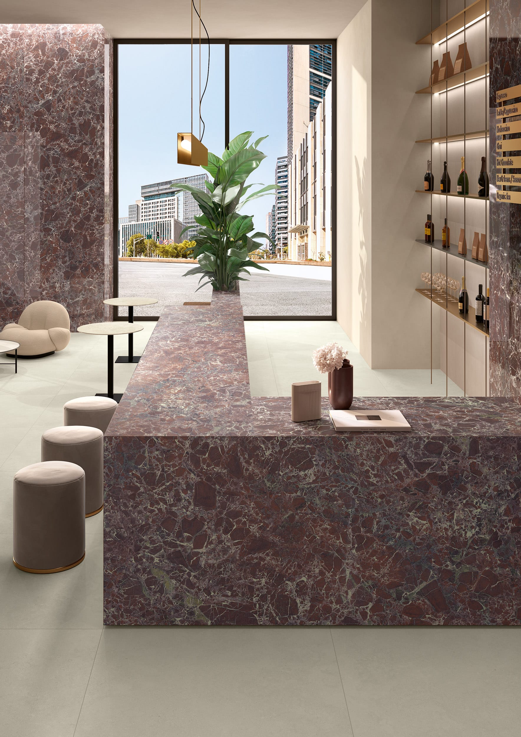 Levante è una grande lastra dall’elegante resa marmorea, pensata per tavoli, top cucina e banconi con una grafica sofisticata e luminosa. Nel formato 163×324 cm e sp. 12 mm, con finiture Silk e LCP, assicura continuità estetica e affidabilità progettuale. È inoltre progettata per facilitare taglio, foratura e sagomatura, e si presta anche a soluzioni d’arredo e rivestimenti coordinati.