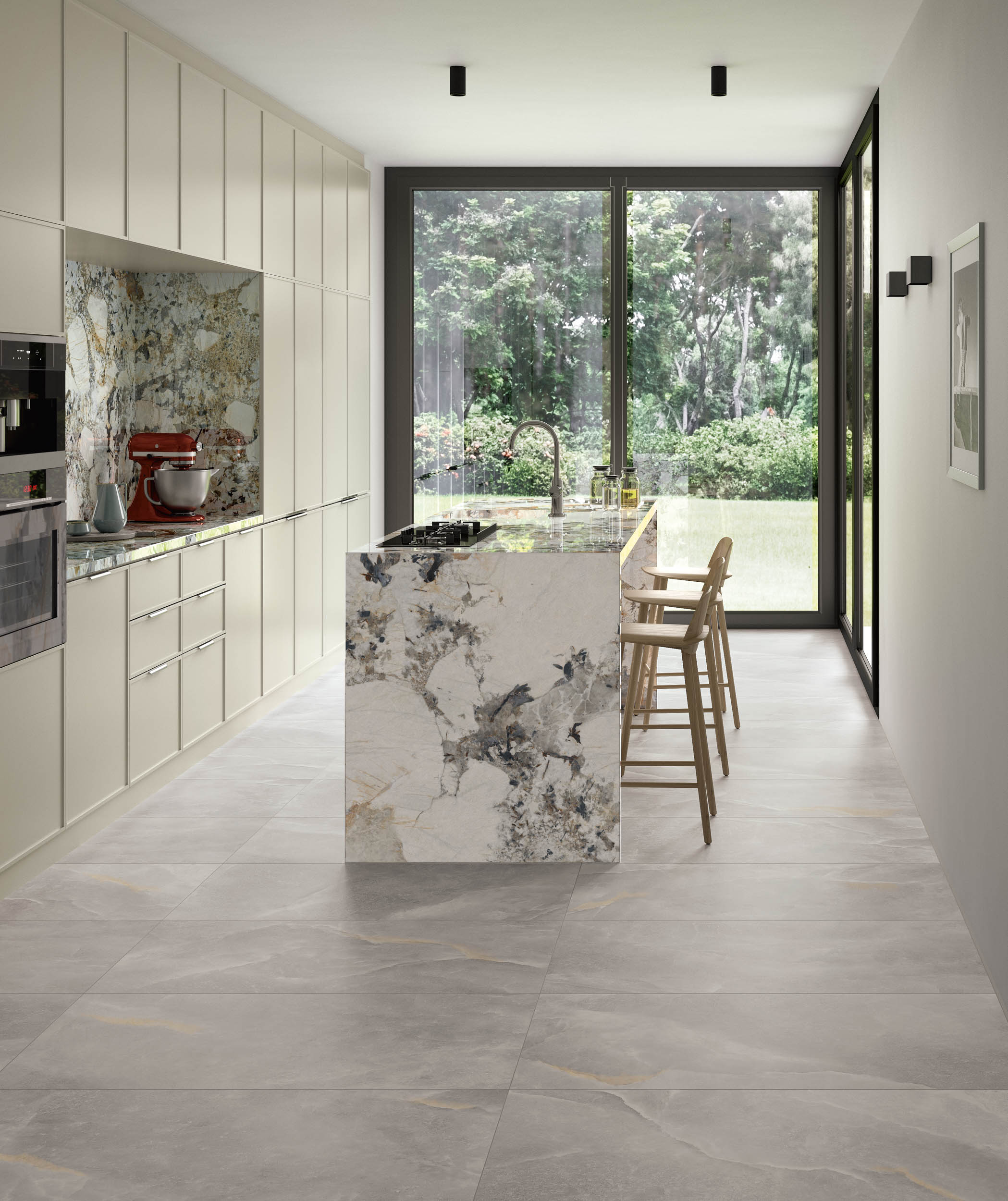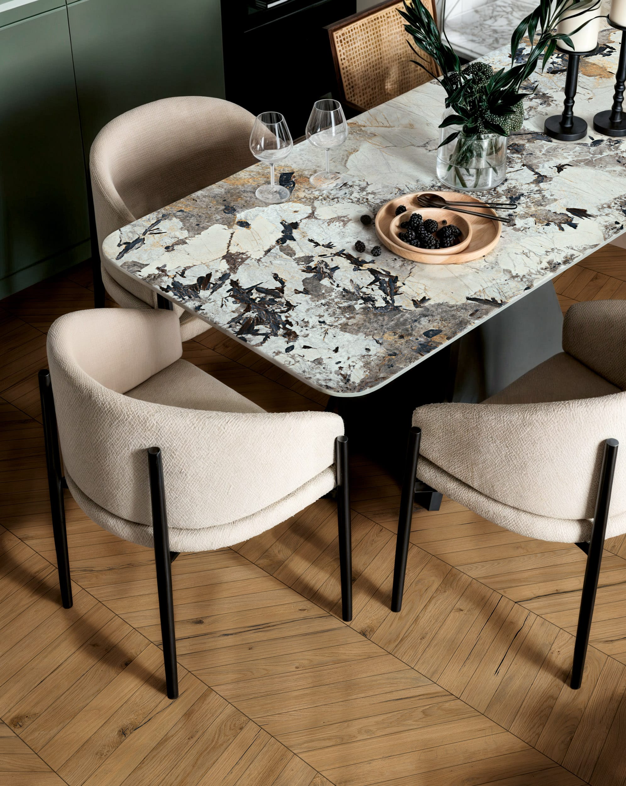 Patagonia unisce frammenti irregolari, trasparenze minerali e tagli netti in una superficie intensa e scenografica. Il disegno è ricco, mai ripetitivo, perfetto per spazi dove il marmo si trasforma in elemento decorativo di forte impatto visivo.